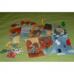 La scatola contiene 84 carte illustrate, 1 plancia per il punteggio (all’ interno della scatola), 6 segnalini in legno (colorati, a forma di coniglio), 36 segnali in cartone numerati da 1 a 6 e le istruzioni.